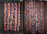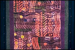 This new work is constructed of hand-woven fabric which have been vat dye discharged. This process removes the original colors of the hand-woven fabric and replaces them with a new color, leaving the texture, pattern and soft hand of the hand-woven fabric.